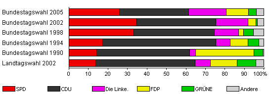 | Bundestagswahl 2005 | 75,3 | 25,8 | 35,5 | 19,4 | 11,3 | 4,0 | 4,0 | |