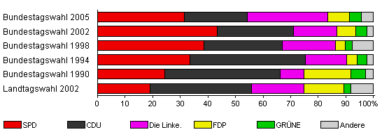 | Landtagswahl 2002 | 49,1 | 18,9 | 37,0 | 19,0 | 14,4 | 2,4 | 8,3 | |