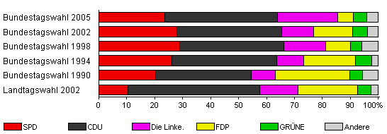 | Bundestagswahl 2005 | 72,1 | 23,6 | 40,3 | 21,5 | 5,6 | 4,9 | 4,2 | |