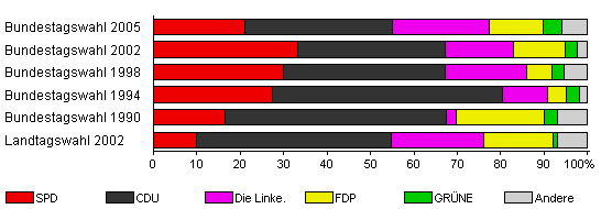 | Landtagswahl 2002 | 65,9 | 9,9 | 44,9 | 21,2 | 16,0 | 1,0 | 7,1 | |