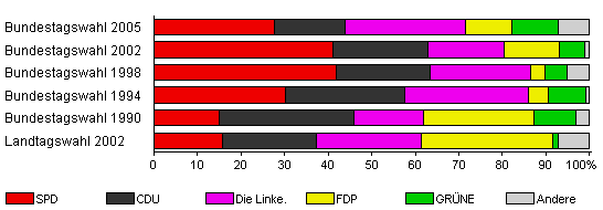 | Bundestagswahl 2005 | 74,5 | 27,7 | 16,1 | 27,7 | 10,7 | 10,7 | 7,1 | |