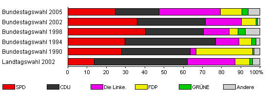 | Bundestagswahl 2005 | 74,6 | 24,7 | 22,6 | 32,2 | 11,0 | 3,4 | 6,2 | |