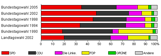 | Bundestagswahl 2005 | 79,9 | 34,7 | 30,0 | 18,2 | 9,4 | 2,4 | 5,3 | |