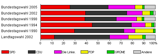 | Bundestagswahl 2005 | 61,1 | 25,7 | 33,1 | 23,4 | 6,5 | 1,5 | 9,8 | |