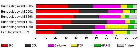 | Bundestagswahl 2005 | 54,6 | 32,3 | 24,5 | 26,9 | 7,0 | 5,2 | 4,2 | |