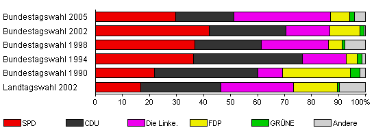| Bundestagswahl 2002 | 65,8 | 42,2 | 28,4 | 16,1 | 11,2 | 1,4 | 0,6 | |