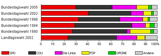 | Bundestagswahl 2005 | 74,8 | 30,0 | 31,2 | 21,0 | 10,1 | 2,9 | 4,8 | |