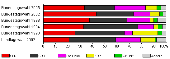 | Bundestagswahl 2005 | 61,7 | 33,6 | 24,2 | 25,3 | 9,2 | 3,5 | 4,3 | |