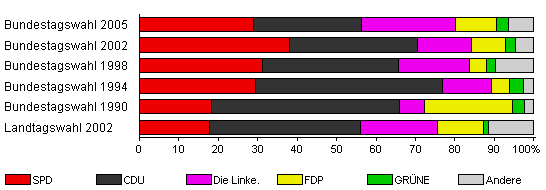 | Landtagswahl 2002 | 59,1 | 17,7 | 38,4 | 19,4 | 11,8 | 1,2 | 11,4 | |