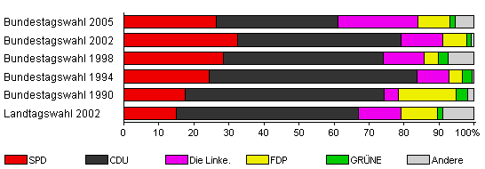 | Bundestagswahl 2005 | 73,3 | 26,5 | 34,7 | 22,8 | 9,1 | 1,5 | 5,3 | |