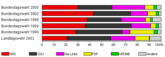 | Bundestagswahl 2005 | 63,7 | 30,1 | 28,6 | 27,4 | 7,6 | 2,5 | 3,8 | |