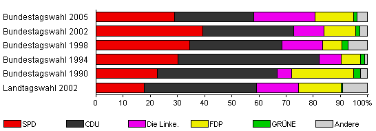 | Bundestagswahl 2005 | 70,1 | 28,8 | 29,2 | 22,6 | 14,3 | 1,3 | 3,9 | |