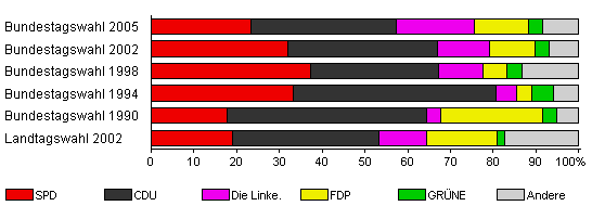 | Bundestagswahl 2005 | 70,7 | 23,3 | 34,1 | 18,1 | 12,7 | 3,4 | 8,5 | |