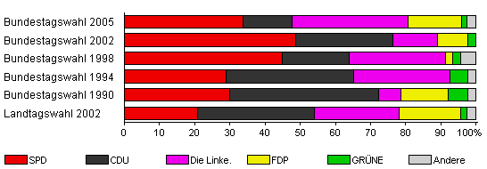 | Bundestagswahl 2005 | 72,7 | 33,8 | 13,8 | 33,1 | 15,2 | 1,4 | 2,8 | |