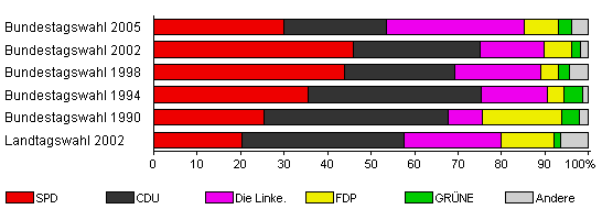| Bundestagswahl 2002 | 61,0 | 45,9 | 29,2 | 14,7 | 6,4 | 1,9 | 1,9 | |