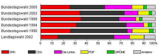 | Landtagswahl 2002 | 55,3 | 14,6 | 49,2 | 13,7 | 12,5 | 0,3 | 9,7 | |