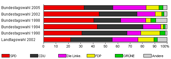 | Landtagswahl 2002 | 50,3 | 21,9 | 33,7 | 20,8 | 12,9 | 2,8 | 7,9 | |