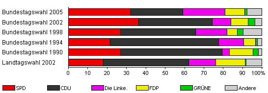 | Bundestagswahl 2005 | 75,3 | 32,2 | 27,0 | 21,8 | 10,0 | 1,4 | 7,6 | |