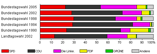 | Landtagswahl 2002 | 57,5 | 12,6 | 46,6 | 17,6 | 8,0 | 0,4 | 14,7 | |