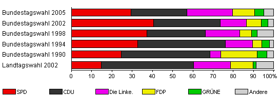 | Landtagswahl 2002 | 54,9 | 14,7 | 45,7 | 18,3 | 11,1 | 1,6 | 8,7 | |