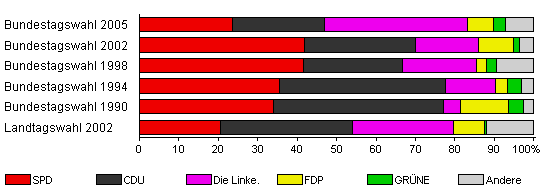 | Bundestagswahl 2002 | 60,2 | 41,8 | 28,2 | 15,9 | 8,9 | 1,6 | 3,7 | |