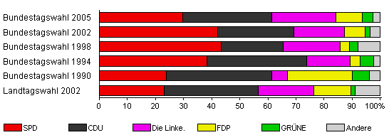 | Bundestagswahl 2005 | 68,5 | 29,7 | 31,6 | 23,0 | 9,4 | 3,7 | 2,7 | |