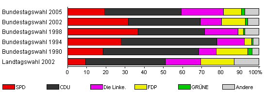 | Bundestagswahl 2005 | 73,1 | 19,2 | 40,2 | 21,9 | 9,4 | 1,8 | 7,6 | |