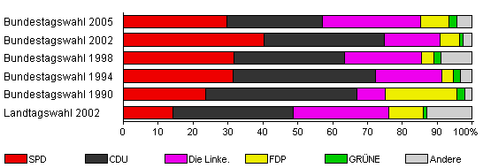 | Bundestagswahl 2005 | 71,1 | 29,7 | 27,3 | 28,2 | 8,0 | 2,3 | 4,5 | |
