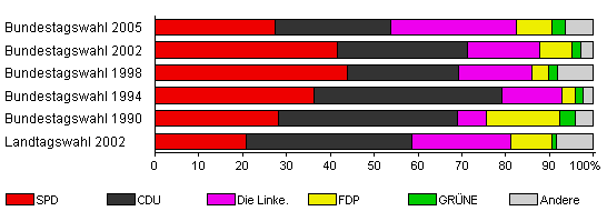 | Bundestagswahl 2005 | 64,8 | 27,5 | 26,2 | 28,6 | 8,3 | 3,0 | 6,4 | |