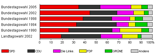 | Bundestagswahl 2005 | 75,7 | 34,5 | 19,0 | 27,5 | 9,4 | 5,1 | 4,6 | |