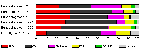 | Landtagswahl 2002 | 60,6 | 9,9 | 53,6 | 14,4 | 13,7 | 0,2 | 8,1 | |