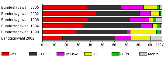 | Bundestagswahl 1998 | 75,3 | 38,1 | 35,0 | 15,6 | 3,7 | 2,1 | 5,5 | |