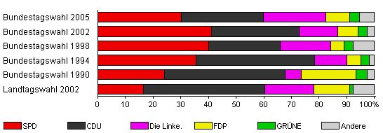 | Bundestagswahl 2005 | 63,2 | 30,1 | 29,7 | 22,5 | 8,7 | 3,6 | 5,3 | |