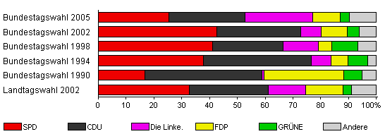 | Landtagswahl 2002 | 49,3 | 32,8 | 28,4 | 13,4 | 13,4 | 3,0 | 9,0 | |
