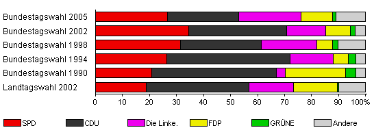 | Bundestagswahl 2005 | 71,5 | 26,7 | 26,4 | 23,1 | 11,6 | 1,2 | 11,0 | |