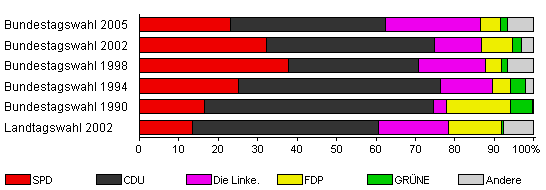 | Landtagswahl 2002 | 53,2 | 13,4 | 47,1 | 17,8 | 13,4 | 0,6 | 7,6 | |