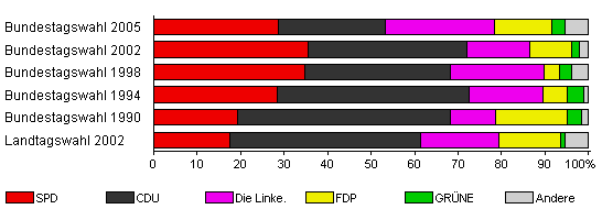 | Bundestagswahl 1994 | 78,3 | 28,5 | 44,0 | 17,0 | 5,5 | 4,0 | 1,0 | |