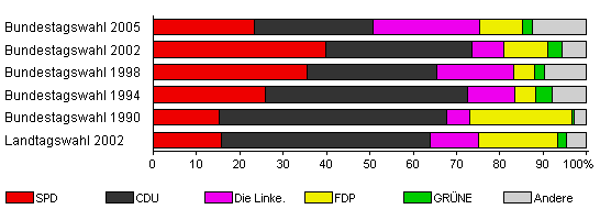 | Landtagswahl 2002 | 60,9 | 15,8 | 48,0 | 11,2 | 18,4 | 2,0 | 4,6 | |