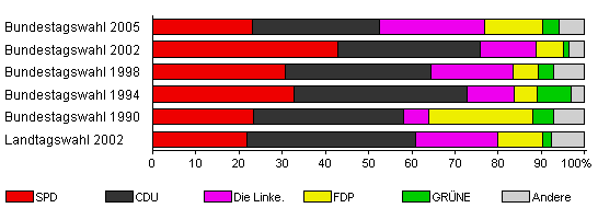 | Bundestagswahl 2005 | 77,0 | 23,1 | 29,5 | 24,3 | 13,3 | 4,0 | 5,8 | |