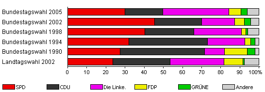 | Bundestagswahl 2005 | 61,5 | 30,0 | 19,8 | 34,5 | 6,2 | 3,3 | 6,2 | |