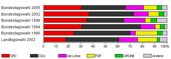 | Bundestagswahl 2005 | 69,0 | 30,8 | 35,3 | 14,8 | 11,0 | 3,8 | 4,5 | |