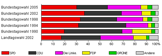 | Bundestagswahl 2005 | 64,2 | 30,2 | 26,3 | 28,4 | 6,0 | 3,8 | 5,2 | |