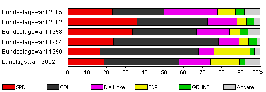 | Bundestagswahl 2005 | 70,7 | 23,0 | 27,0 | 27,8 | 9,4 | 4,6 | 8,2 | |