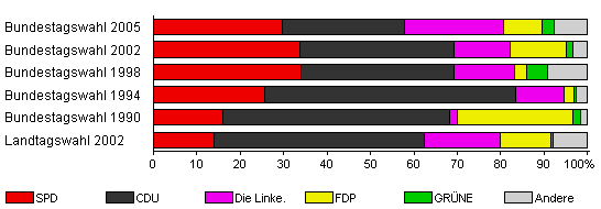 | Bundestagswahl 2005 | 69,4 | 29,7 | 28,1 | 22,9 | 8,9 | 2,6 | 7,8 | |