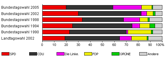 | Landtagswahl 2002 | 56,0 | 18,7 | 45,8 | 9,9 | 12,8 | 1,0 | 11,8 | |