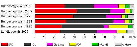 | Landtagswahl 2002 | 54,2 | 25,5 | 36,9 | 20,5 | 9,7 | 0,7 | 6,7 | |