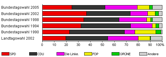| Landtagswahl 2002 | 45,9 | 19,5 | 34,9 | 25,6 | 9,9 | 0,4 | 9,7 | |