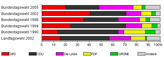 | Bundestagswahl 2005 | 76,3 | 19,9 | 28,3 | 28,8 | 7,4 | 2,8 | 12,8 | |
