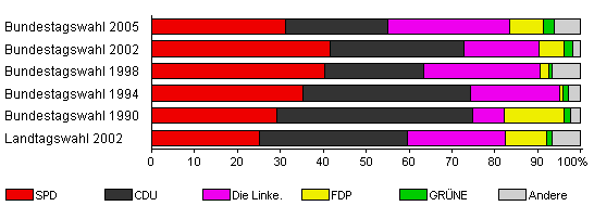 | Landtagswahl 2002 | 53,1 | 25,1 | 34,5 | 22,8 | 9,7 | 1,1 | 6,7 | |