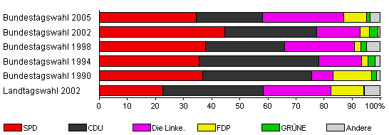 | Bundestagswahl 2005 | 62,8 | 34,4 | 23,6 | 29,0 | 8,0 | 1,3 | 3,8 | |